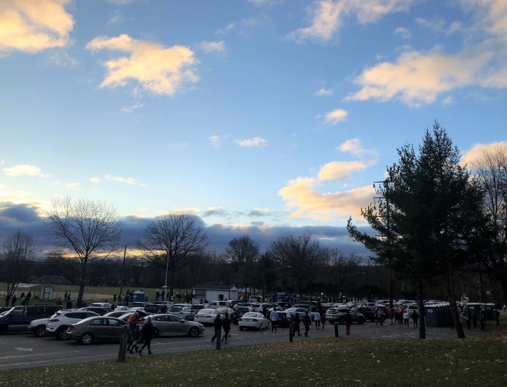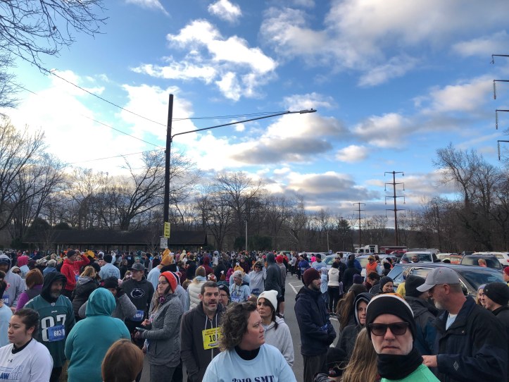 This is my third year in a row running the SMT Turkey Trot 5K, but my photos from this year’s race don’t do it justice. That’s because I didn’t leave as early as in past years, and I got caught in bumper-to-bumper “race traffic.” Nearly 3,000 runners head to this small town near Harrisburg for one of the region’s most popular turkey trots. Parking volunteers were wonderful–I must have passed 10 of them directing the sea of traffic to tightly-packed rows of cars at the borough park. But I missed my running club’s group photo at the appointed time, and barely had time to hop out of my car once I parked, only to join another line–the porta-potty line.