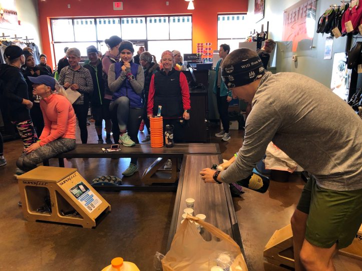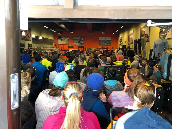 Fred Joslyn welcomes runners! Standing-room only, inside the shop. There were lots of us just outside the doors too!