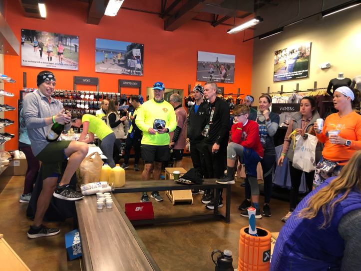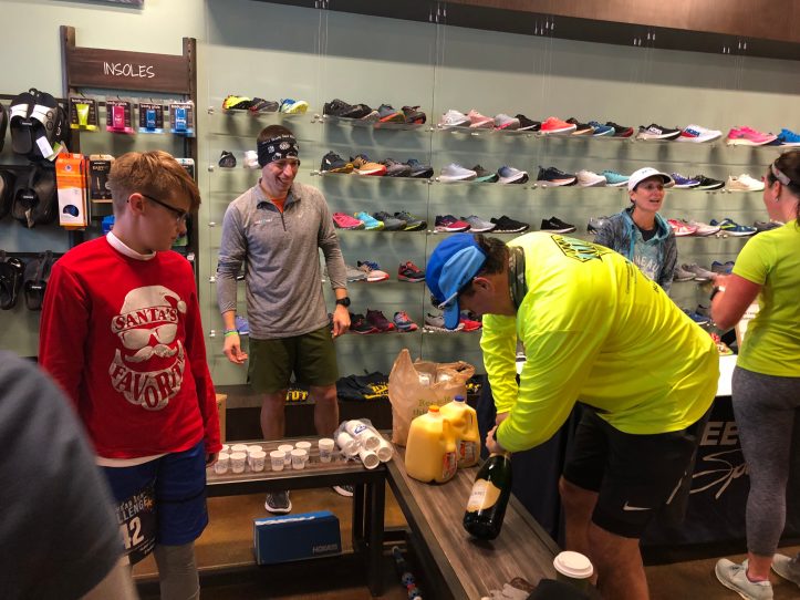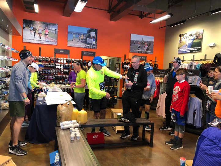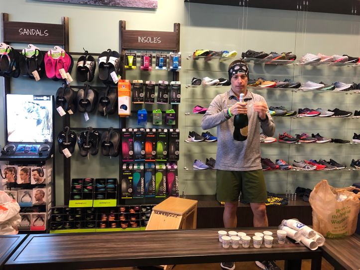 12 noon: Back at Fleet Feet, Fred Joslyn preps for a celebratory champagne pop. Many runners have reached their goals of 3-4 laps.