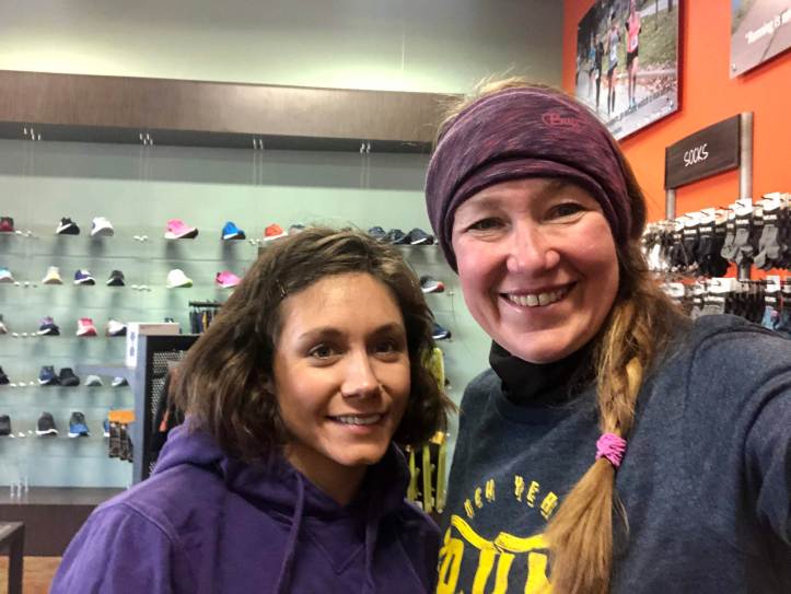 Back at Fleet Feet, Shelby Joslyn offers congratulations! What a great day.