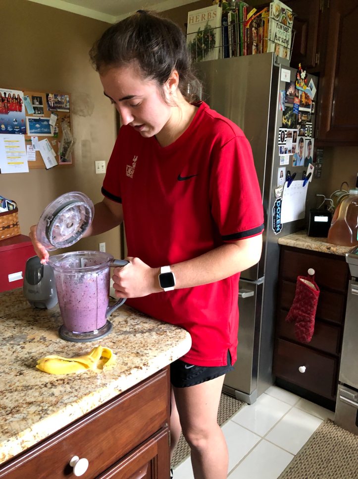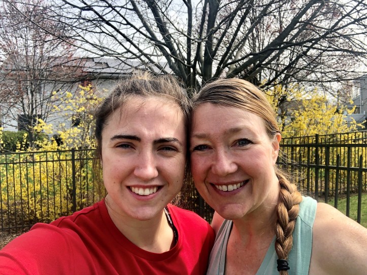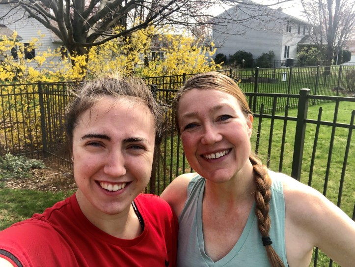Today, I was thrilled to run my 5K virtually in my neighborhood with my college-age daughter who is home, sheltering safely in place with us. A college soccer player, she needed to run for her workout today, so I asked her to pace me and try to help me break my 5K PR–a tall task without an actual race going on around us. We chose a somewhat hilly route, but every tough uphill also evened out with a nice downhill. We were so close… we actually TIED my 5K PR which I’m pretty happy about. And… my daughter made us delicious post-race smoothies.