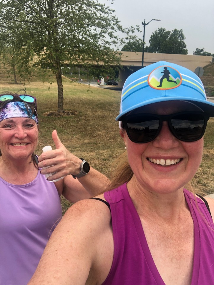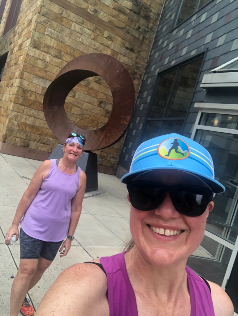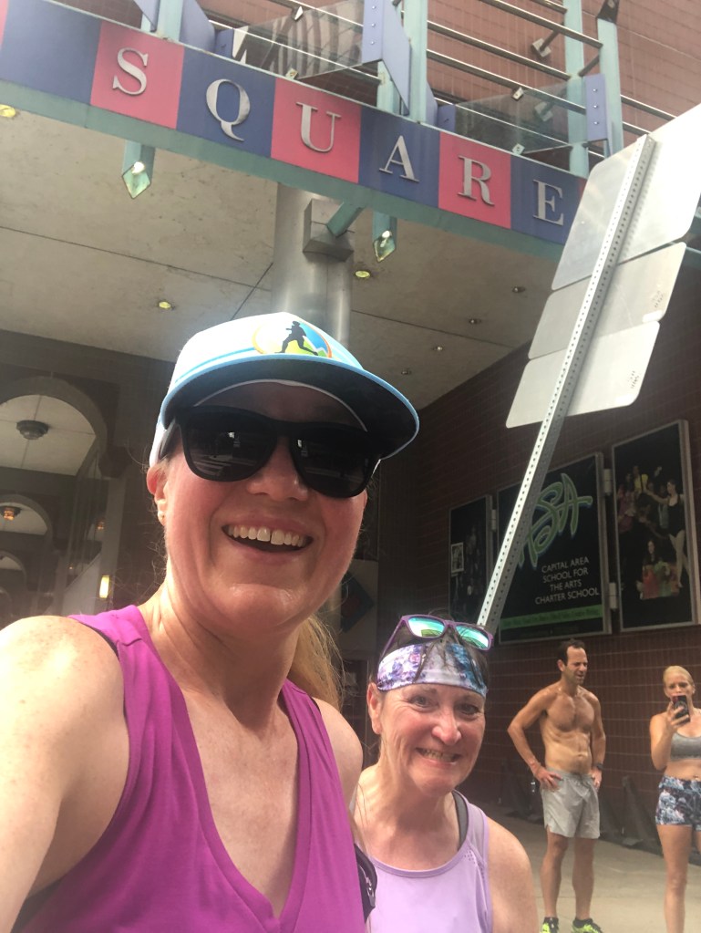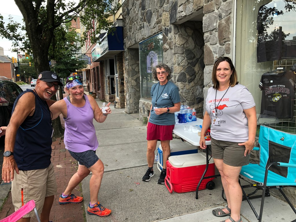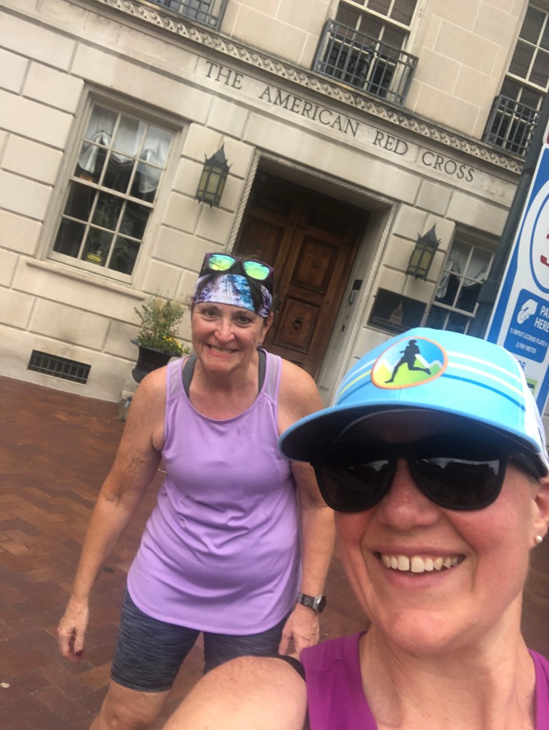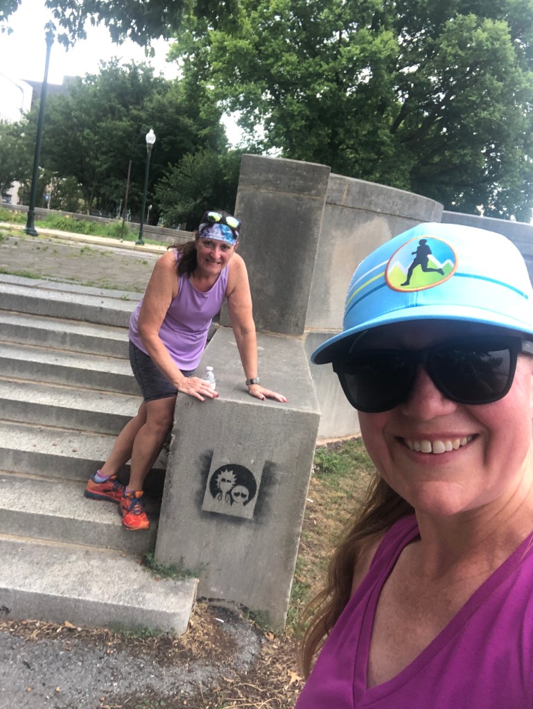 Cathy and I had fun catching up and chatting while we tracked down all eight locations. It was super humid, so we were grateful to see our friend Ali and other volunteers at the water stop set up at the half-way point.