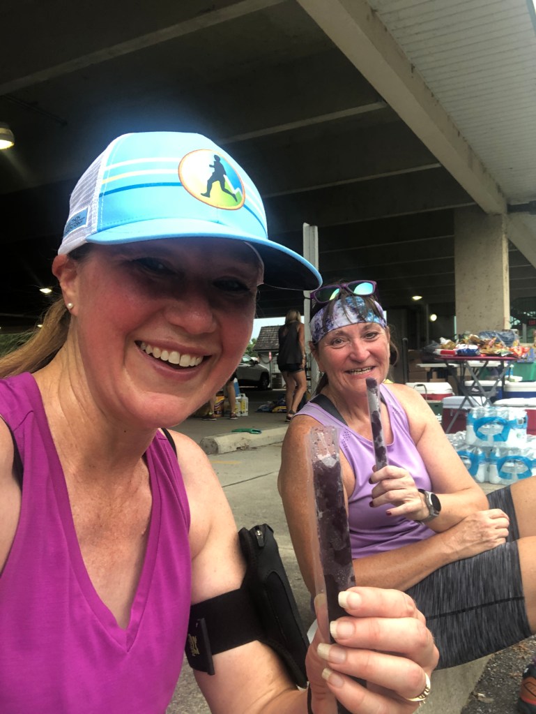 When Cathy & I arrived back at the finish line on City Island, we loved seeing some more River Runner friends while enjoying ice cold water and freeze pops. Awesome race organizer Marjorie had gathered random prizes for runners as well. Cathy chose our little “treasure chest” and sure enough, inside was a note saying we both won Rita’s gift cards. We certainly did not win “fastest team” awards but we do believe we were the fastest overall purple team. LOL